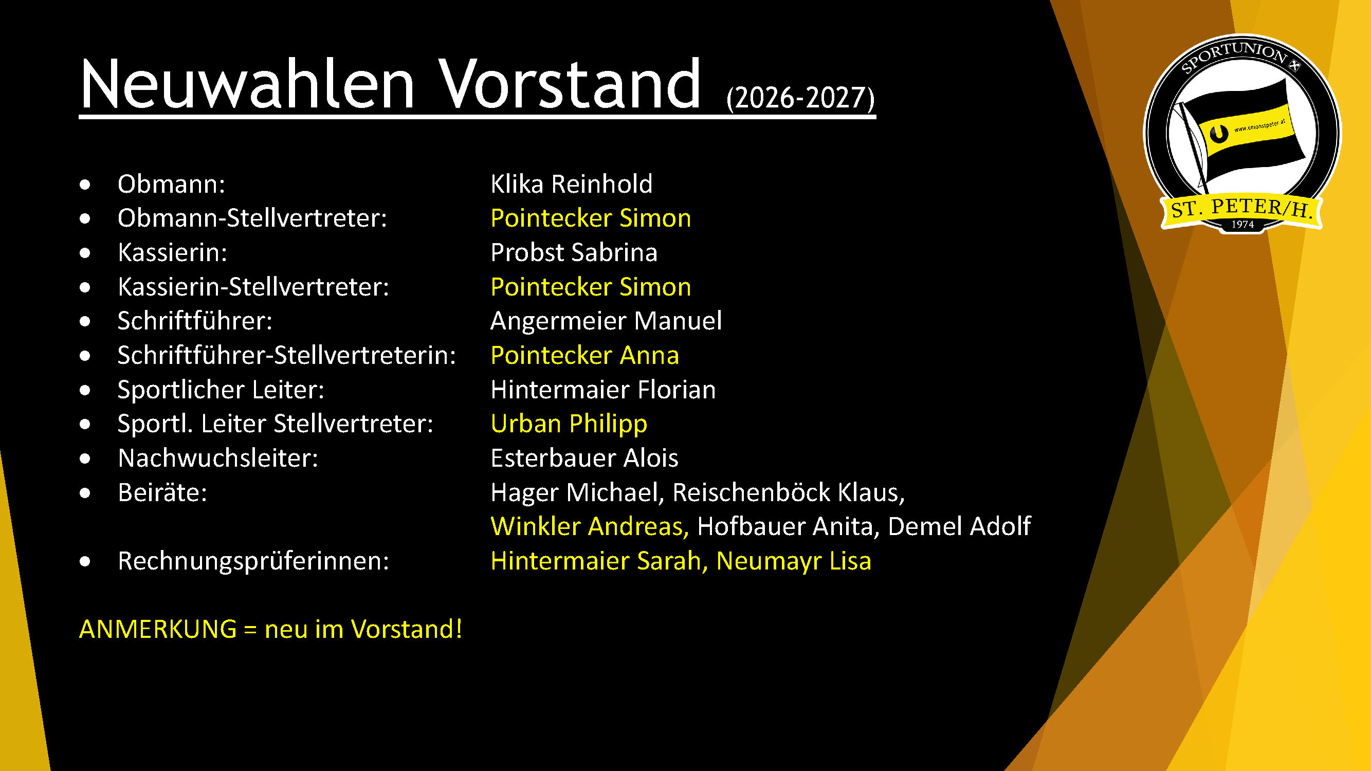 Von einer Rekordzahl an aktiven Fußballerinnen und Fußballern berichtete Obmann Reinhold Klika in der Jahreshauptversammlung der Sportunion Raiba St. Peter am 28.11.2025 beim Wirt z´Aching. Rund 200 Kinder, Jugendliche und Erwachsene trainieren und spielten im Herbst 2025 in 12 Mannschaften für die Union. Im Mittelpunkt der Versammlung stand die Neuwahl des Vorstandes, bei der Obmann Klika in seinem Amt bestätigt und Simon Pointecker zu seinem neuen Stellvertreter gewählt wurde.